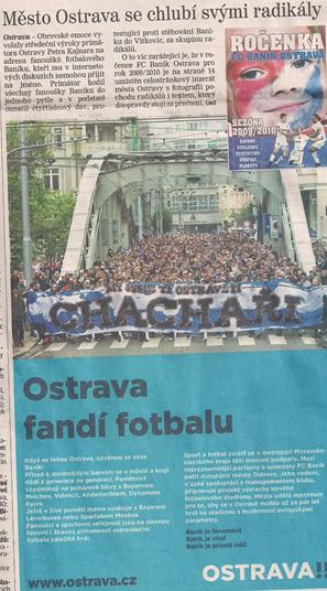 O to víc zarážející je, že v ro?ence FC Baník Ostrava pro rok 2009/2010 je na stran? 14 umíst?n celostránkový inzerát m?sta Ostravy s fotografií radikál? i textem, který doopravdy stojí za p?e?tení. (Aleš Uher)
